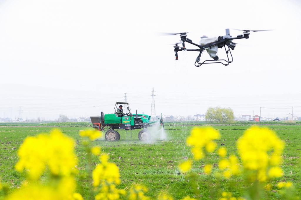 近日,正在江苏省兴化市陈堡镇蒋庄村,农人驾驶植保无人机、自走式喷杆喷雾机实施杂草防治功课。 发(周社根 摄)!
