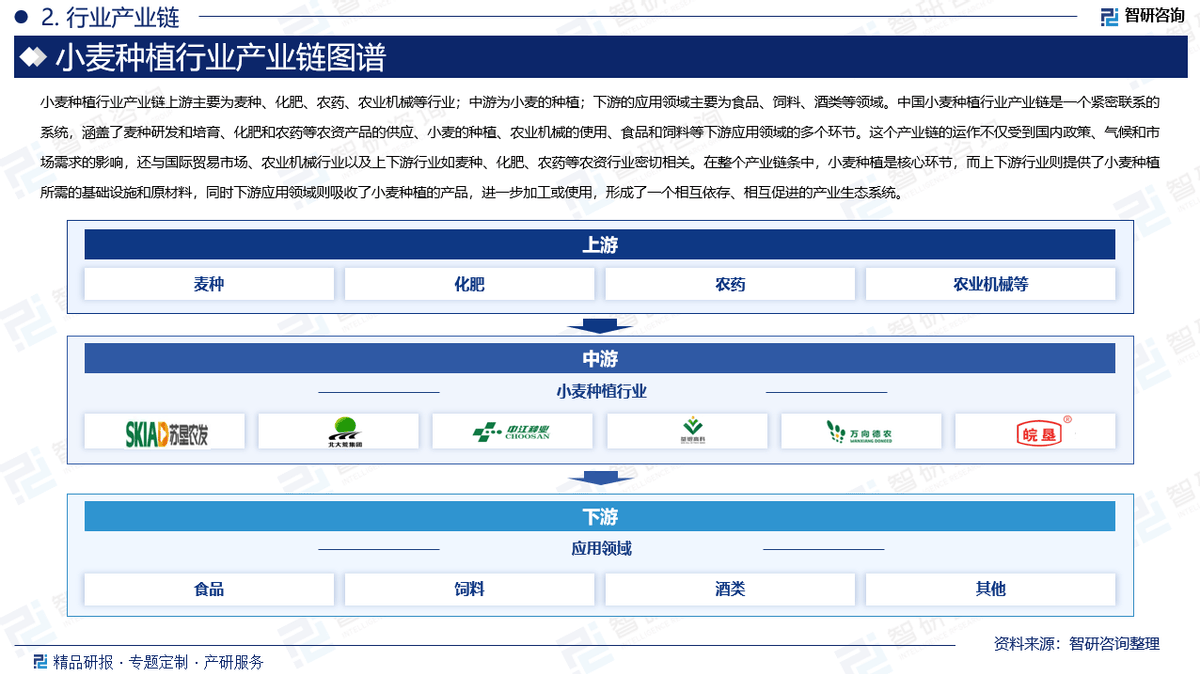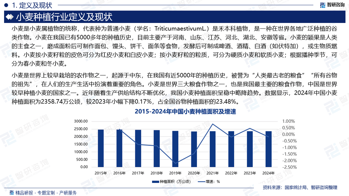 正在当下高度消息化的社会布景下,精准的数据阐发取深切的行业研究已成为企业计谋规划、市场拓展以及投资决策不成或缺的指南针。本研究演讲基于智研团队对行业的深刻理解取精准把握,通过采集全球范畴内的小麦种植行业数据,使用先辈的数据阐发模子,对行业的过去、现正在取将来进行了全面、系统的分解。深切挖掘了各个细分市场的运转纪律,对市场容量、增加速度、合作款式以及盈利模式等环节目标进行了详尽的量化阐发取质性解读。演讲内容不只涵盖了宏不雅经济的走势阐发、财产政策的深度解读,还包罗了买方行为的详尽描绘、手艺立异的趋向预测。我们分析使用了定量阐发取定性等多种研究方式,力图正在确保数据切确性的同时,也能捕获到市场动态中的微妙变化。此外,我们还出格关心了全球范畴内的行业领先企业,通过对比阐发它们的运营策略、市场结构以及立异能力,为业界读者供给了贵重的行业洞察取运营。做为业内出名的研究机构,智研研究团队深知高质量的研究演讲对于企业决策的主要性。因而,正在编撰本演讲的过程中,我们一直科学、严谨的研究立场,力图通过详实的数据、深切的阐发以及研判性的概念,为读者供给一份实正有价值的行业指南。小麦是小麦属动物的统称,代表种为通俗小麦(学名:TriticumaestivumL。)是禾本科动物,是一种界各地普遍种植的谷类做物。小麦正在我国已有5000多年的种植汗青,目上次要产于河南、山东、江苏、、湖北、小麦的颖果是人类的从食之一,磨成面粉后可制做面包、馒头、饼干、面条等食物,发酵后可制成啤酒、酒精、白酒(如伏特加),或生物质燃料。小麦按小麦籽粒的皮色可分为红皮小麦和白皮小麦;按小麦籽粒的粒质,可分为硬质小麦和软质小麦;按照播种季候,可分为春小麦和冬小麦。小麦是世界上较早栽培的农做物之一,发源于中东,正在我国有近5000年的种植汗青,被誉为“人类最陈旧的粮食”“所有谷物的先人”,正在人们的出产糊口中饰演着主要的脚色。小麦是世界三大粮食做物之一,也是我国最次要的粮食做物,中国是世界较早种植小麦的国度之一。近年跟着出产供给布局不竭优化,我国小麦种植面积呈稳中略降趋向。数据显示,2024年中国小麦种植面积为2358。74万公顷,较2023年小幅下降0。17%,占全国谷植面积的23。48%。小麦种植行业财产链上逛次要为麦种、化肥、农药、农业机械等行业;中逛为小麦的种植;下逛的使用范畴次要为食物、饲料、酒类等范畴。中国小麦种植行业财产链是一个慎密联系的系统,涵盖了麦种研发和培育、化肥和农药等农资产物的供应、小麦的种植、农业机械的利用、食物和饲料等下逛使用范畴的多个环节。这个财产链的运做不只遭到国内政策、天气和市场需求的影响,还取国际商业市场、农业机械行业以及上下业如麦种、化肥、农药等农资行业亲近相关。正在整个财产链条中,小麦种植是焦点环节,而上下业则供给了小麦种植所需的根本设备和原材料,同时下逛使用范畴则接收了小麦种植的产物,进一步加工或利用,构成了一个彼此依存、彼此推进的财产生态系统。中国小麦种植行业厂商次要分布正在、、山东、江苏、上海、河南、安徽等省市,北大荒、农发种业、荃银高科、登海种业、万向德农、秋乐种业、中江种业、皖垦种业、中化集团、先正达、首农集团等。做为一个了中国小麦种植十余年成长的专业机构,智研征询但愿可以或许取所有努力于取小麦种植行业企业联袂共进,供给更多无效消息、专业征询取个性化定制的行业处理方案,为行业的成长尽绵薄之力。1:本演讲焦点数据更新至2024年12月(演讲中非上市企业受企业信批影响,相关财政目标或存正在必然的畅后性),演讲预测区间为2025-2031年。2:除一手调研消息和数据外,国度统计局、中国海关、行业协会、上市公司公开演讲(招股仿单、让渡仿单、年报、问询演讲等)等权势巨子数据源亦配合形成本演讲的数据来历。一手材料来历于研究团队对行业内沉点企业获取的一手消息数据,次要采访对象有企业高管、行业专家、手艺担任人、下旅客户、分销商、代办署理商、经销商以及上逛原料供应商等;二手材料来历次要包罗全球范畴相关行业旧事、公司年报、非盈利性组织、行业协会、机构及第三方数据库等。3:演讲焦点数据基于智研团队严酷的数据采集、筛选、加工、阐发系统以及自从测算模子,确保统计数据的精确靠得住。4:本演讲所采用的数据均来自合规渠道,阐发逻辑基于智研团队的专业理解,清晰精确地反映了阐发师的研究概念。智研征询做为中国财产征询范畴带领品牌,以“用消息驱动财产成长,为企业投资决策赋能”为品牌。公司融合定量阐发取定性阐发方式,用自从研发算法,连系行业交叉大数据,通过多元化阐发,挖掘定量数据背后根因,分解定性内容背后逻辑,客不雅实正在地阐述行业现状,审慎地预测行业将来成长趋向,为客户供给专业的行业阐发、市场研究、数据洞察、计谋征询及相关处理方案,帮力客户提拔认知程度、盈利能力和分析合作力。次要办事包含精操行研演讲、专项定制、月度专题、可研演讲、贸易打算书、财产规划等。供给周报/月报/季报/年报等按期演讲和定制数据,内容涵盖政策监测、企业动态、产物价钱变化、投融资概览、市场机缘及风