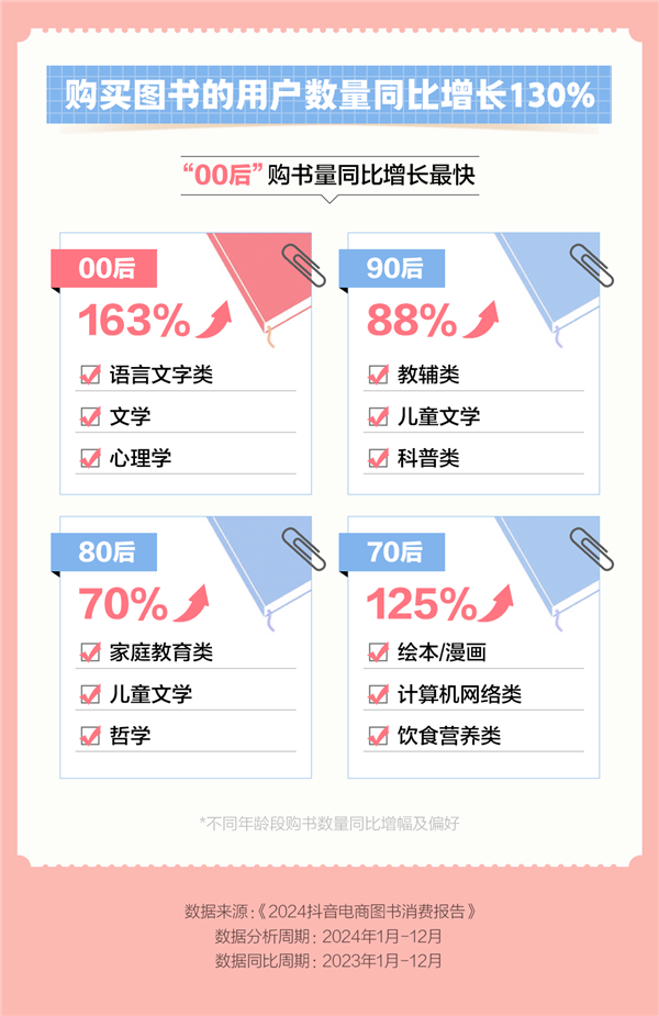 短视频、曲播以及货架场景,以其愈加丰硕全面的内容展现、愈加曲不雅高效的互动形式,能够更好地满脚分歧条理读者的购书需求。演讲显示,2024年,通过抖音电商采办图书的用户数量同比增加超 130%,“00后”买书热情高涨。“00后”购书数量同比增加最快达163%,偏心言语文字、文学、心理学类图书;“80后”“90后”购书数量别离增加70%和88%,喜好买教辅、家庭教育、儿童文学等图书;“70后”则更关心饮食养分类册本。