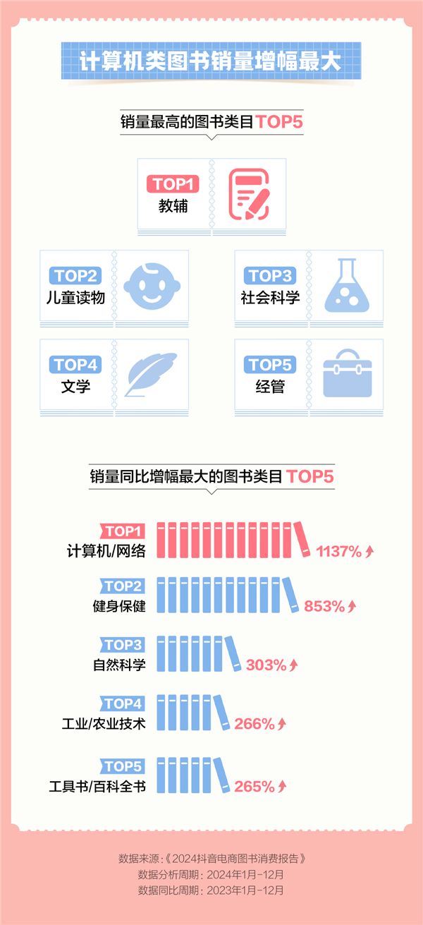 数据显示,无论是抢手的儿童读物、文学、经管类图书,仍是小众的工业农技类、东西书,过去一年正在抖音电商都遭到读者青睐。教辅、儿童读物、社会科学、文学、经管类成为该平台销量最高的五大图书类目;计较机/收集位列销量增幅榜首位,天然科学、工业/农业手艺和东西书/百科全书等专业范畴图书也颇受欢送。
