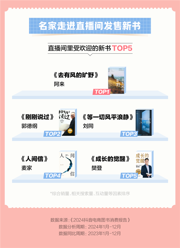 1月10日,《2024抖音电商图书消费演讲》(下文简称 “演讲”)发布,从图书销量、用户买书偏好、出书社成长等维度,呈现了抖音电商过去一年的图书消费概况。演讲显示,抖音电商全年图书销量超7。3亿单,采办图书的用户数量同比增加超 130%,跨越50家出书社的曲播成交额同比翻倍。此中,《去有风的田野》《信》等曲直播间最受欢送的新书。