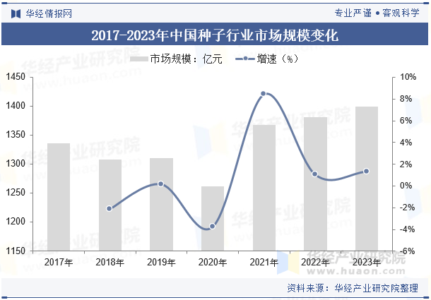 种子做为农产物的根本出产材料,是农产物发展的焦点取环节,同时也是谷植上逛中主要的一环。中国种子市场规模有所下降,近些年逐渐回暖,2023年中国种子行业市场规模已超1400亿元。