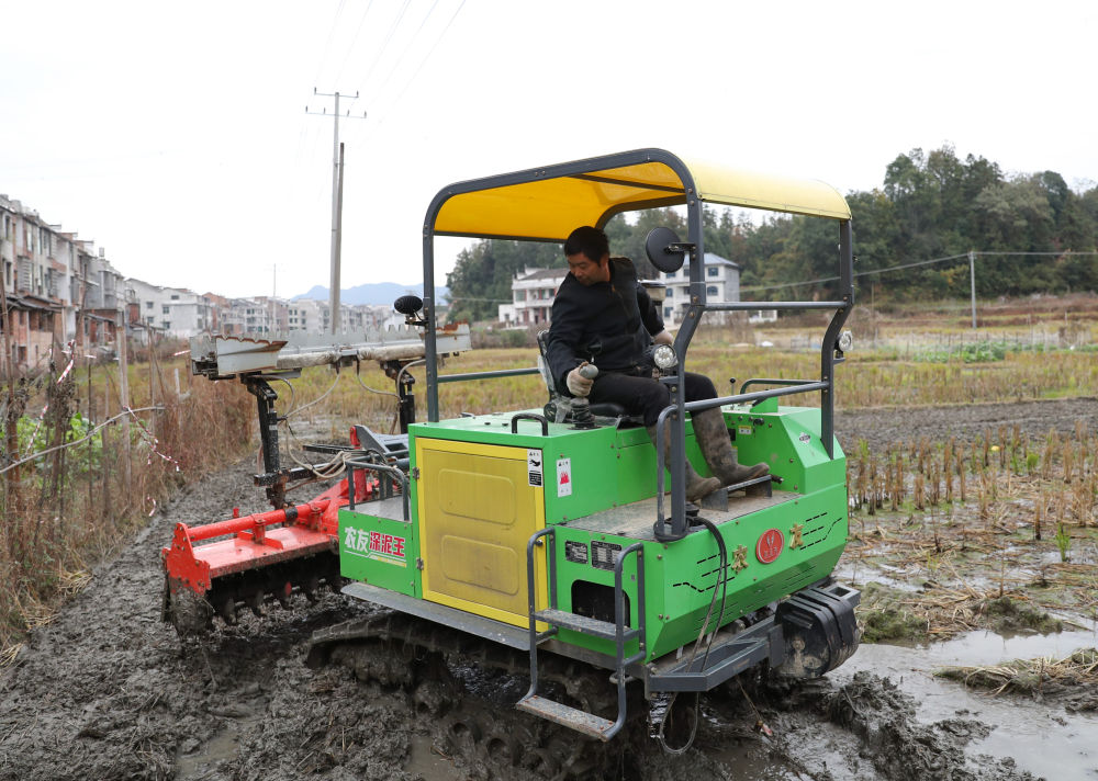 2024年11月26日,正在湖南省娄底市双峰县荷叶镇,一名农机手正在驾驶旋耕机。记者 王婧嫱 摄。