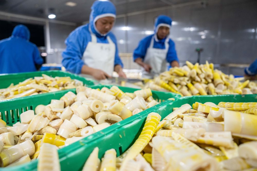 2024年11月27日,工人正在湖南省益阳市桃江县马迹塘镇笋竹特色财产园内一家鲜笋加工企业出产车间加工鲜笋。竹笋财产是桃江县的保守特色财产,本地依托丰硕的竹林资本,积极成长竹笋深加工财产。记者 陈思汗 摄。