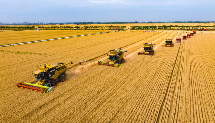 2024年5月29日,正在河南省驻马店市西平县老王坡高尺度农田,机收编队正在收成小麦。发(赵永涛 摄)。